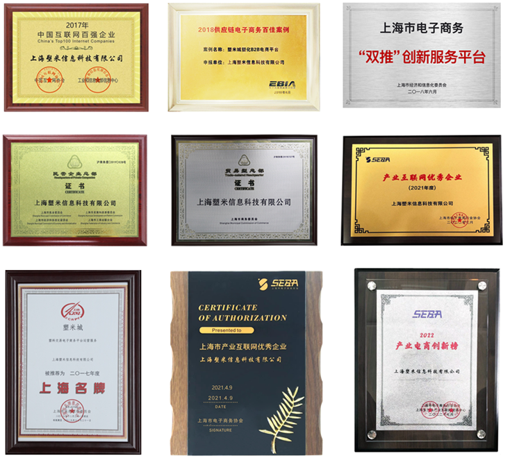 作为塑化B2B龙头产业电商,塑米城在自身的成长和发展过程之中,曾多次获得行业认可。先后入选中国互联网百强企业、上海市电子商务“双推”创新服务平台、上海供应链创新与应用示范企业、中国产业电商百强榜、产业产业互联网优秀企业及2022产业电商百强榜。先后被认定为上海名牌、上海市首批民营企业总部、上海市第三批贸易型总部企业。