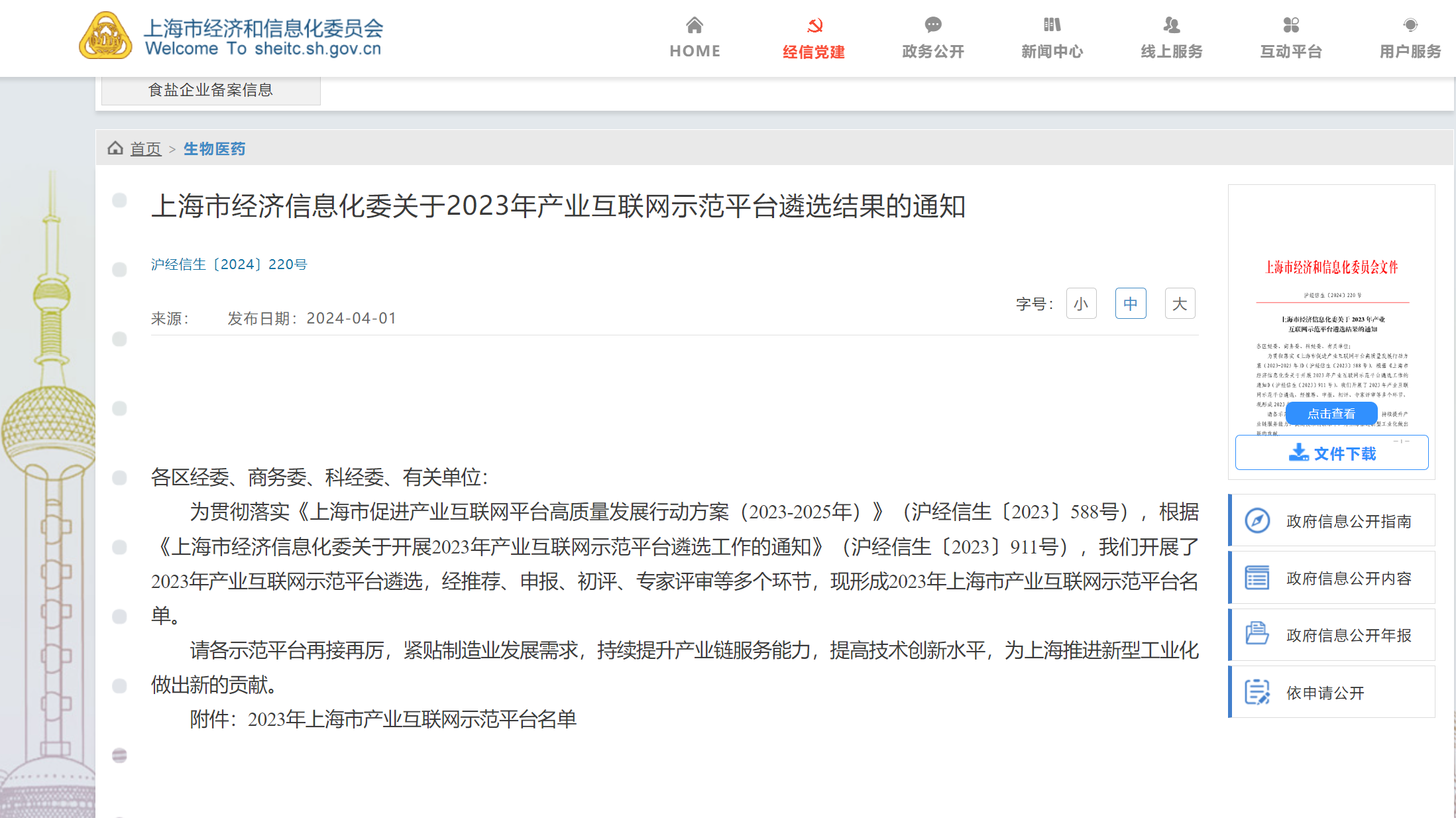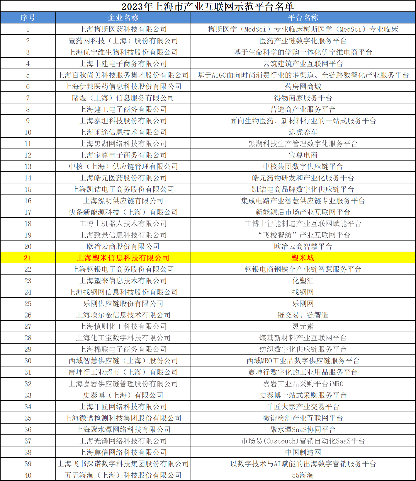 近日,由上海市经济和信息化委员会开展的2023年产业互联网示范平台遴选结果发布,经推荐、申报、初评、专家评审等多个环节,塑米城成功入选2023年上海市产业互联网示范平台。