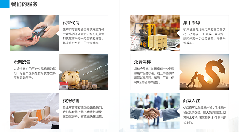 对于上游供应商,塑米城通过提供大数据分析系统服务、SAAS服务、BI系统服务、WMS系统服务、供应链整合服务等,与中石化、中石油、埃克森美孚、巴斯夫等国内外优质石化厂达成战略合作。对于下游企业客户,塑米城提供专业的信息系统赋能,包括ERP、CRM、银企直联、发票直联等系统,实现企业在订单、合同、发票、物流等方面的一体化管理。在交易服务方面,塑米城推出了集采、寄售等服务;在仓储物流服务方面,提供智慧共享仓;在解决中小型企业资金痛点方面,推出了企业理财、账期授信、代采代销、塑米云贷等供应链服务。通过这些优质服务,塑米城助力企业客户实现数字化采购升级,实现降本增效的目标。